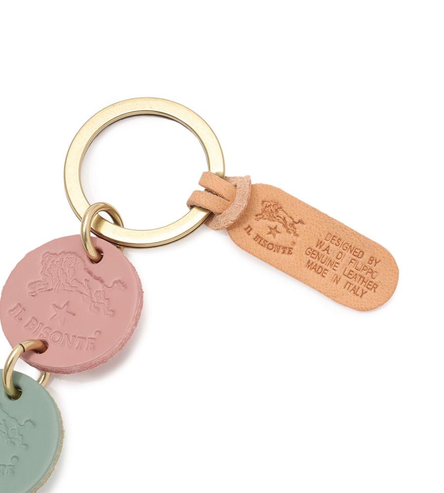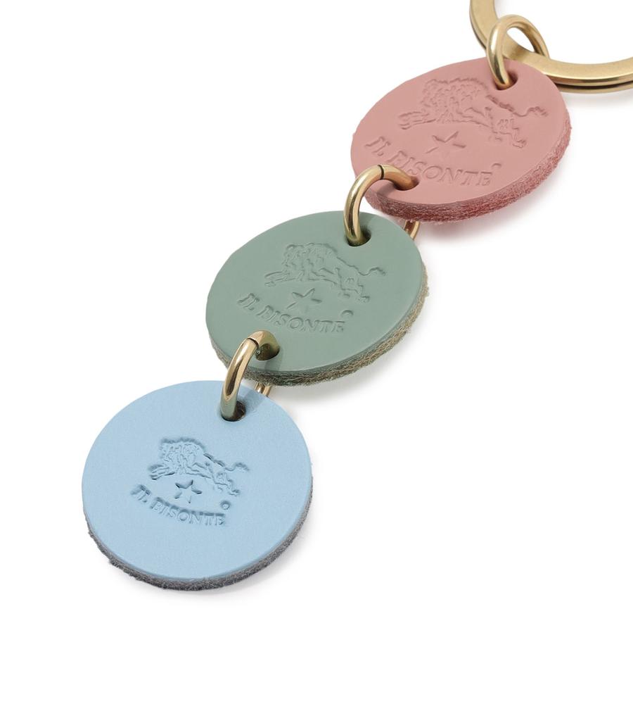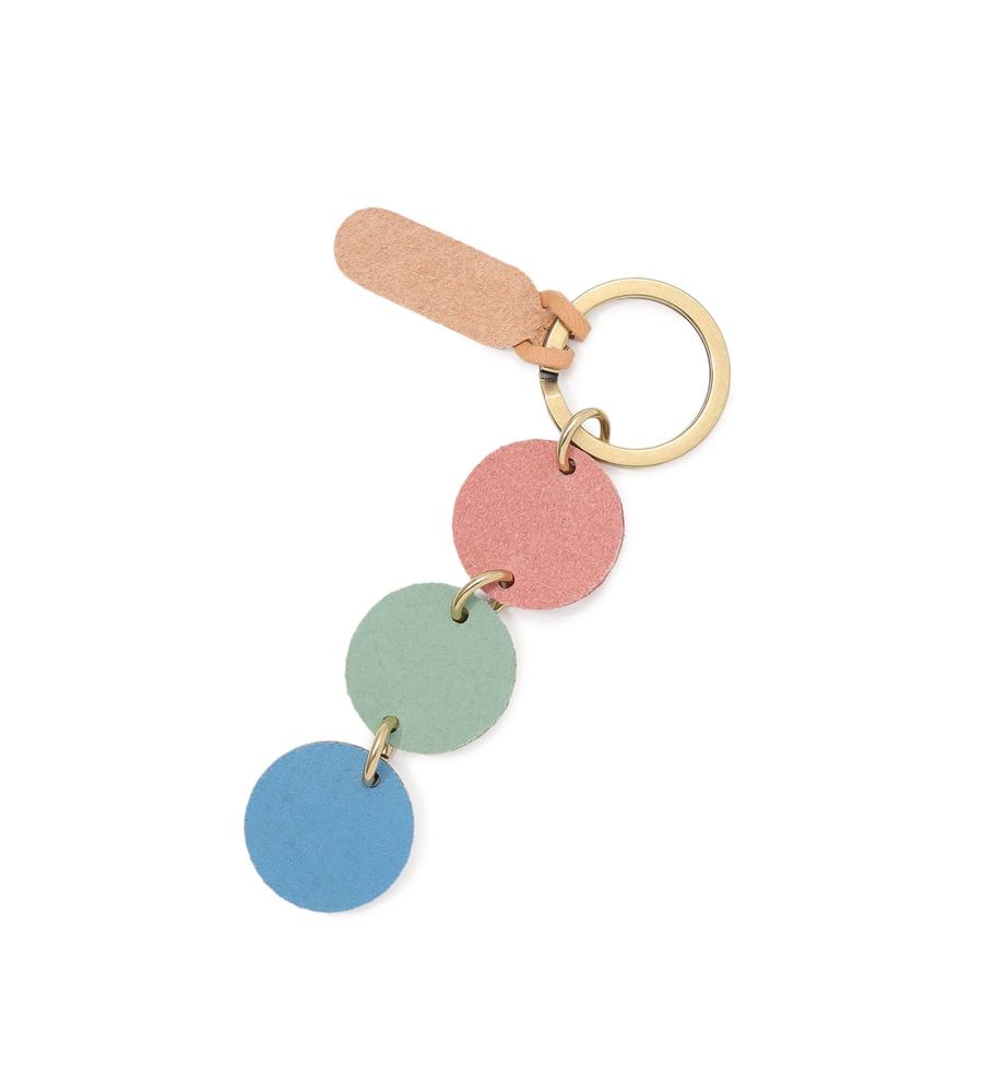 連なる3色のレザーモチーフが大人可愛いキーリング。かさばらず、軽快な持ち心地なのも魅力です。ギフトにもおすすめのアイテム。