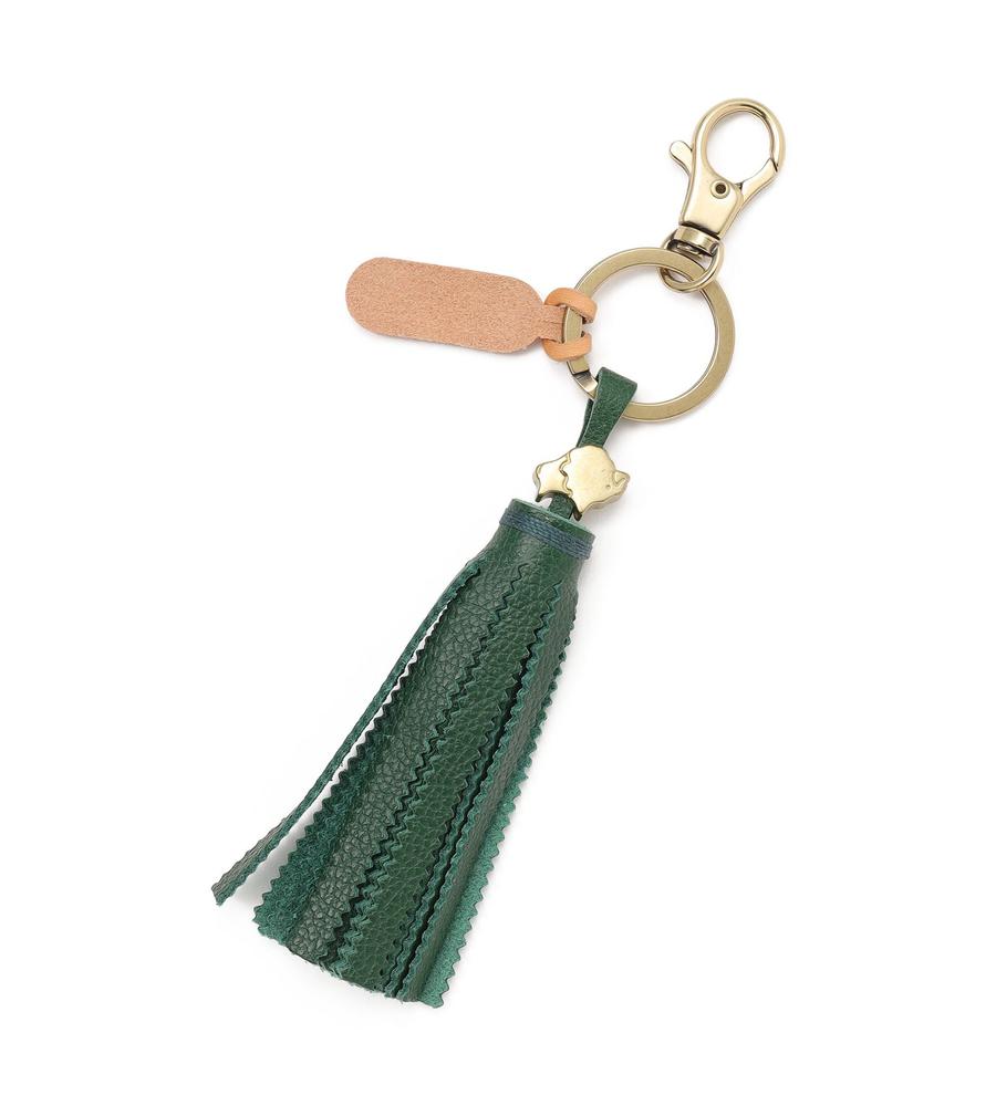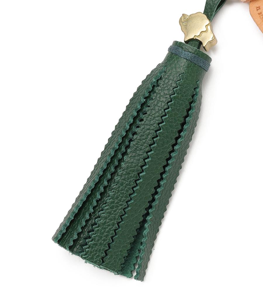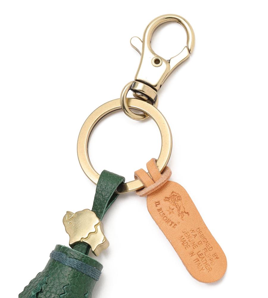 手に馴染むタッセルモチーフのキーリング。ギザギザカット、ブランドタグ、メタルパーツがデザインのポイント。フック付きなためバッグやベルトループにも装着可能。上質な牛革製で、IL BISONTEらしいヴィンテージ感が漂う一品です。