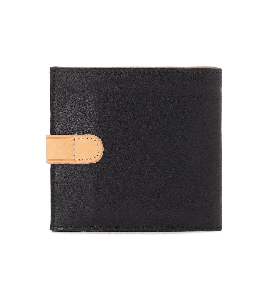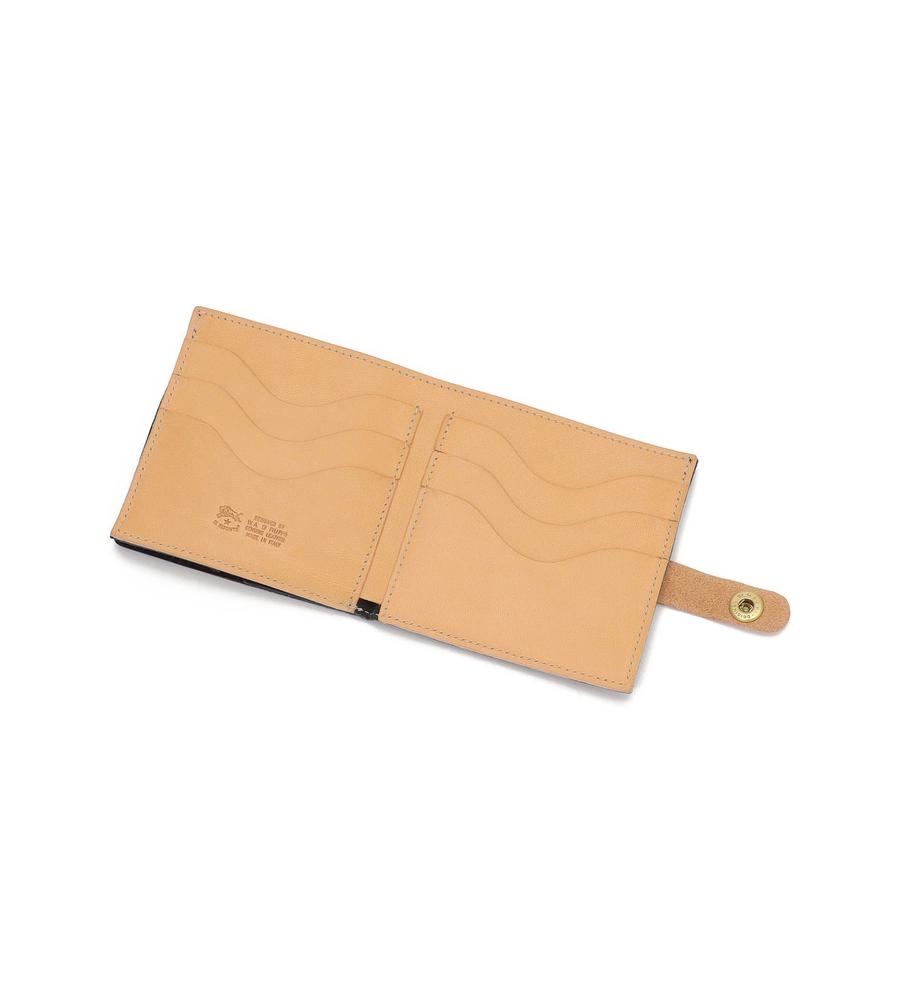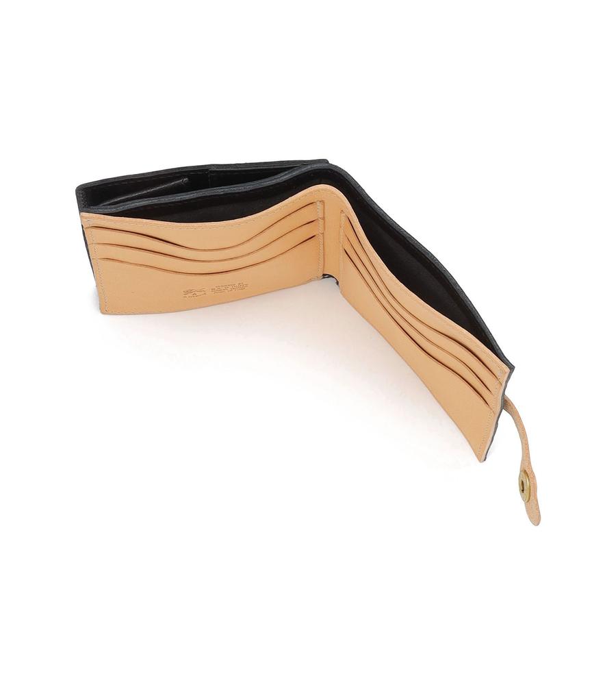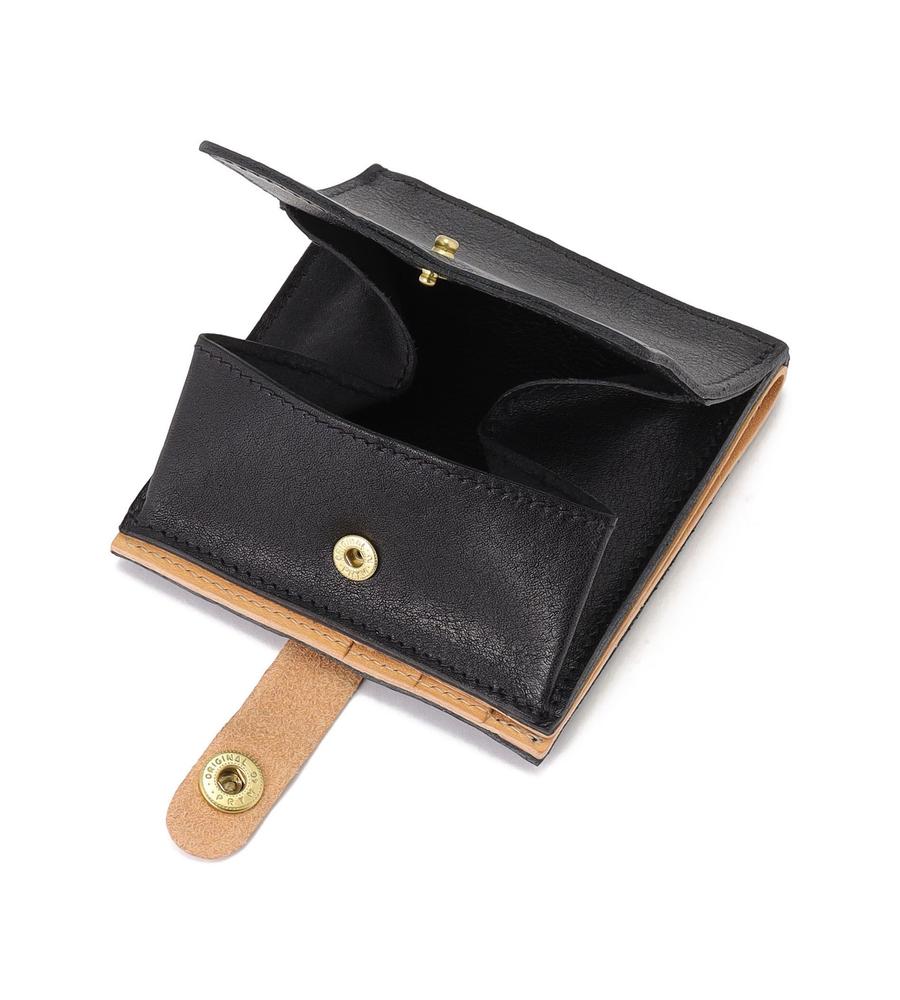 ボタンにシグネチャーロゴを型押ししたウォレットです。表と内側の配色切り替えがポイント、大きく開く外付けのコインケースで出し入れしやすくデザインしました。使うほどに手に馴染む本牛革ならではの質感もポイントです。