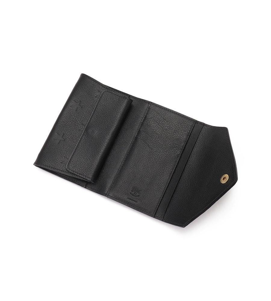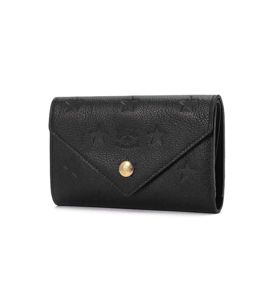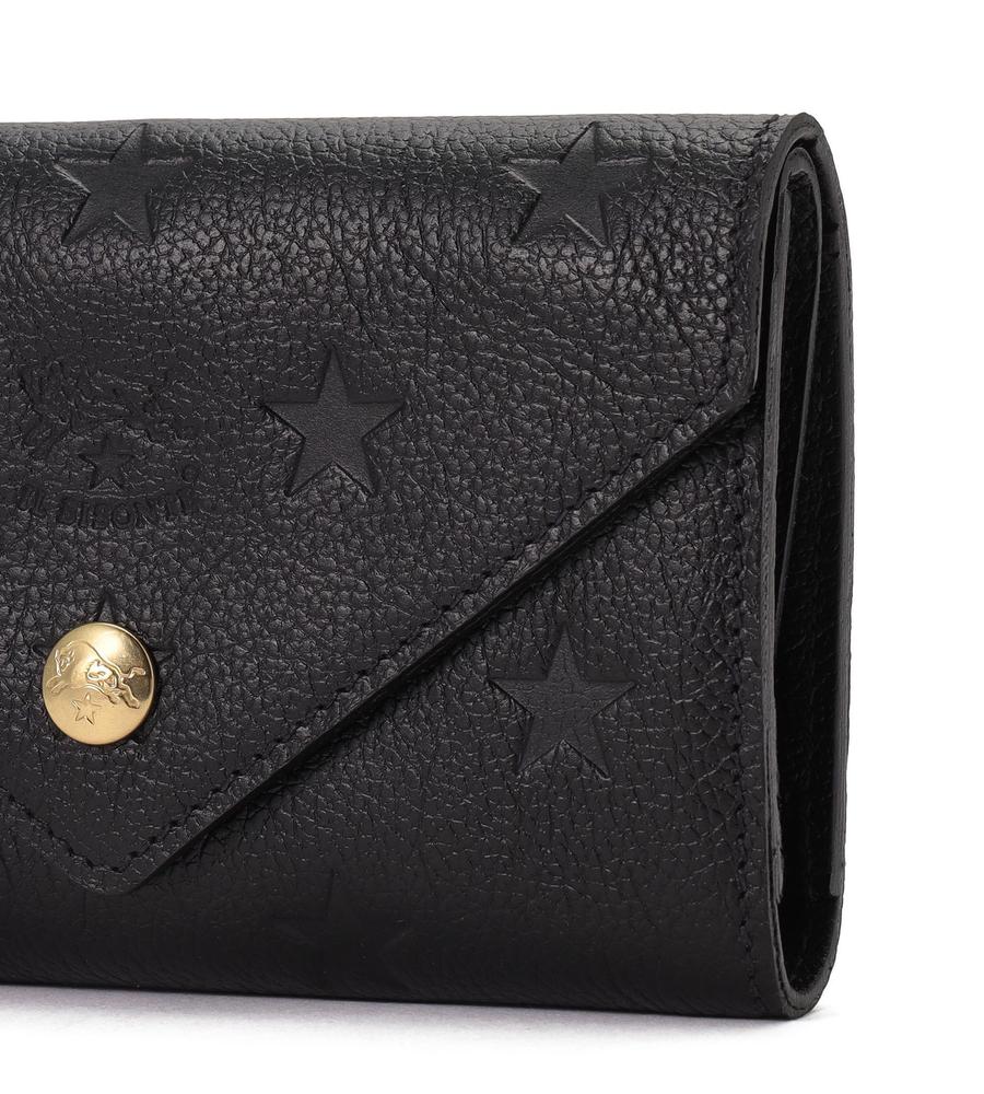 クラシックカラーのレザーにスターモチーフを型押ししたフラップ式ウォレット。優れた収納力を保ちながら、大きすぎないミディアムサイズに仕上げています。中央にはバイソンロゴと金ボタンを配置。上質なレザーの風合いも魅力です。