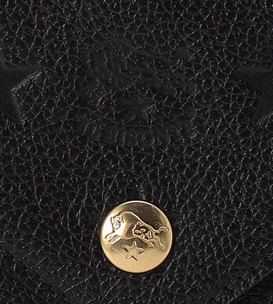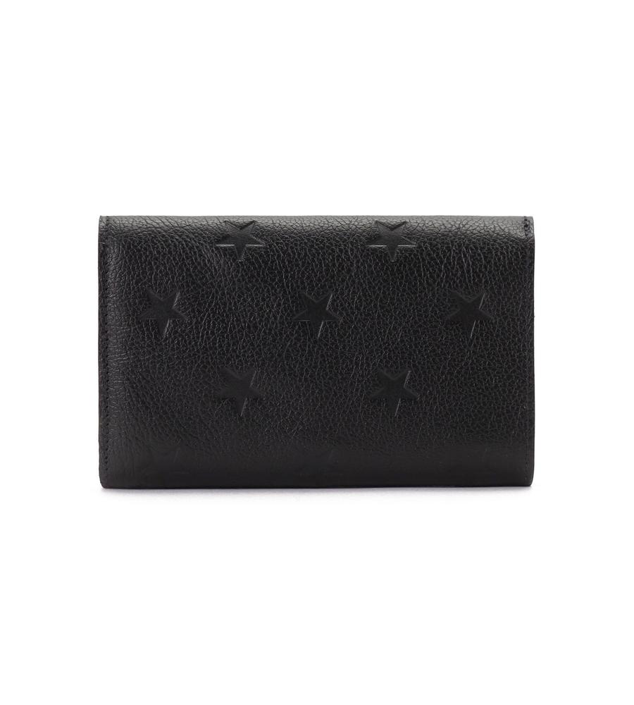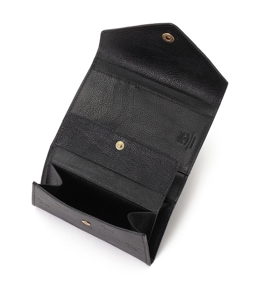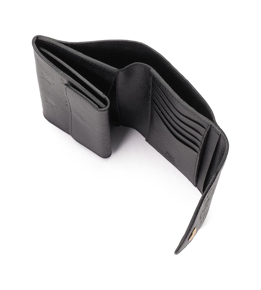 クラシックカラーのレザーにスターモチーフを型押ししたフラップ式ウォレット。優れた収納力を保ちながら、大きすぎないミディアムサイズに仕上げています。中央にはバイソンロゴと金ボタンを配置。上質なレザーの風合いも魅力です。