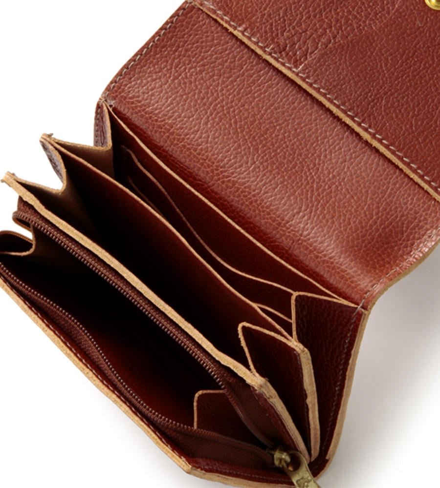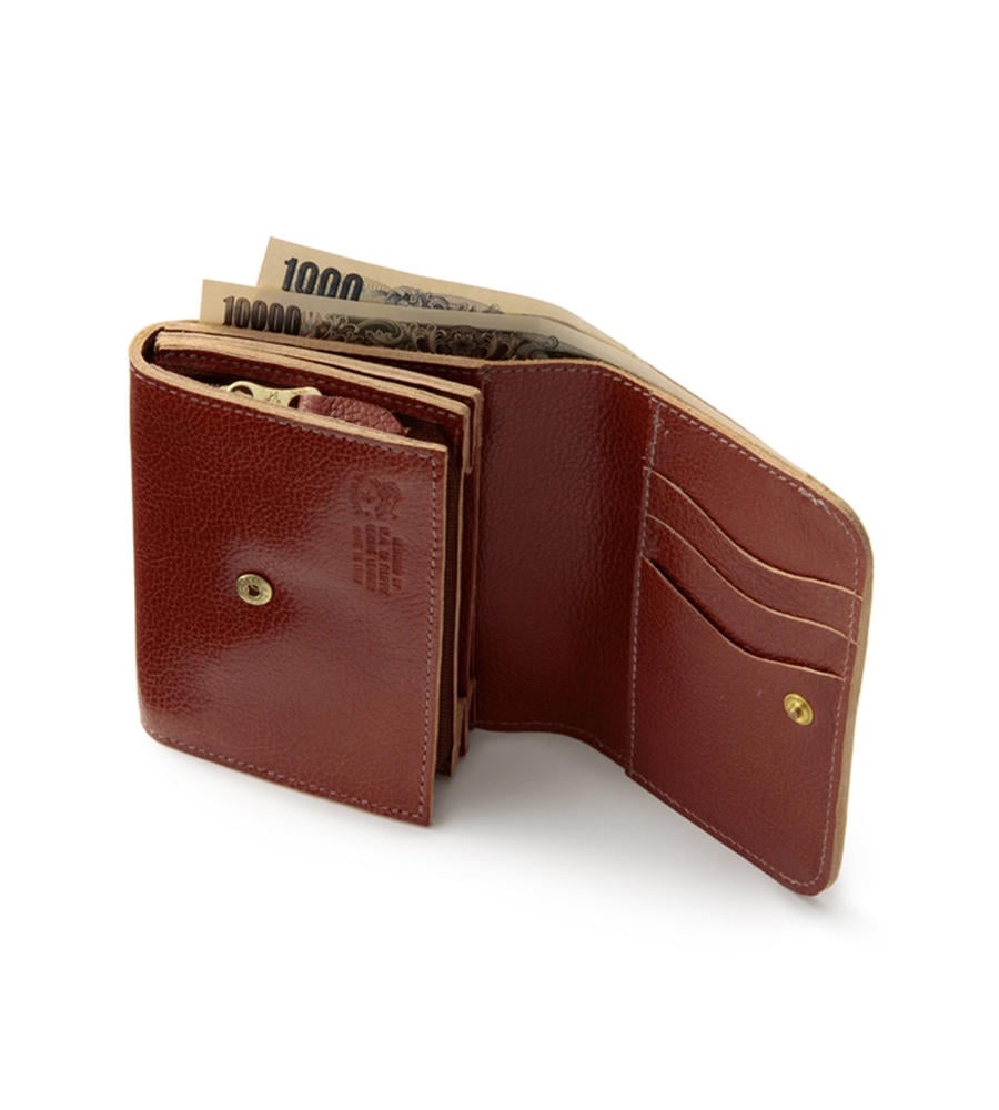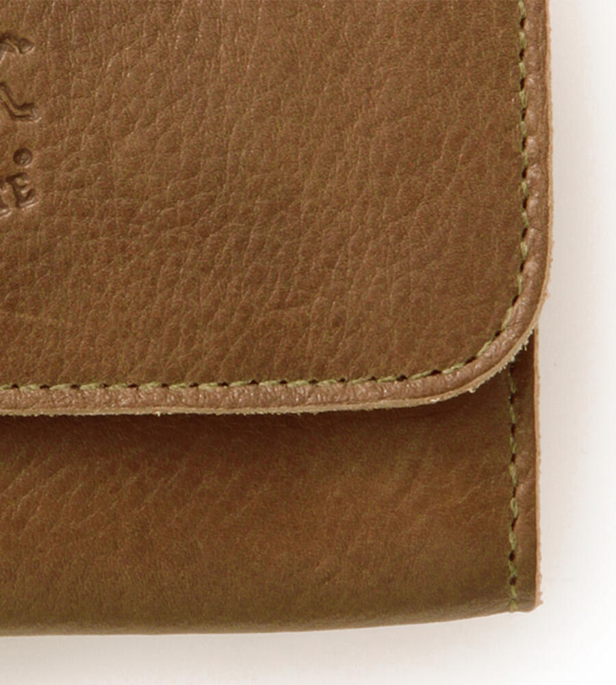 シンプルでユニセックスにご使用いただける二つ折りウォレット。フラップを開くと、ラウンドジップの小銭入れと、じゃばら式のポケットで中身をひと目で確認できます。フラップの裏側にもカードを収納できるので、良く使うカードの整理にもちょうどいい実用的なデザインです。