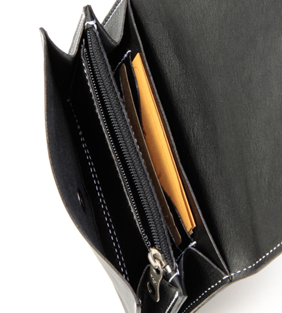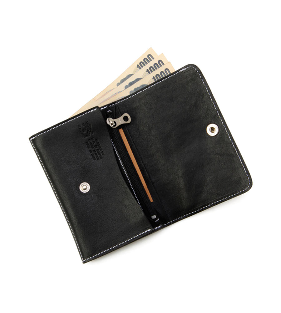 スペックを絞り込んでコンパクトサイズにこだわった2つ折りサイフは、ジーンズのバックポケットにも収まります。札入れ、ジップポケット、マチつきカードケースがついているので、使いやすさはお墨つき。