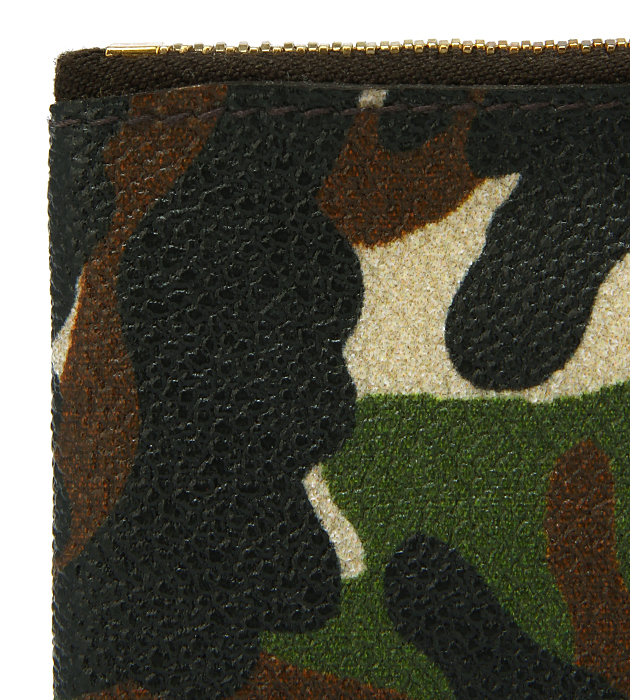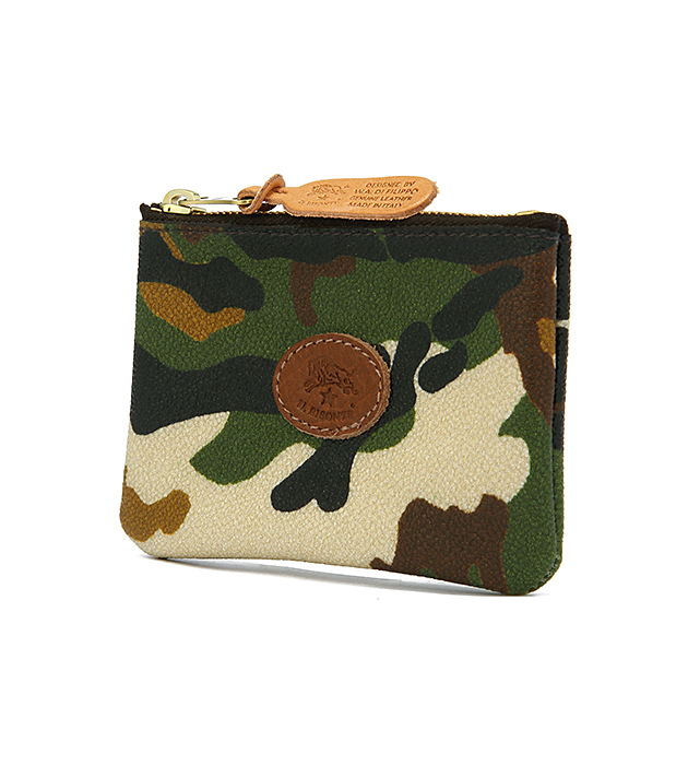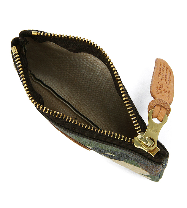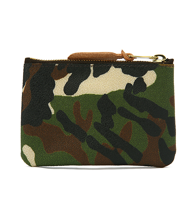 PVC加工のカモフラージュキャンバスを採用した、シンプルなコインパースです。ロゴが刻印されたレザーを真ん中とジップの引手に使用。より男心をくすぐるアイテムとなっています。