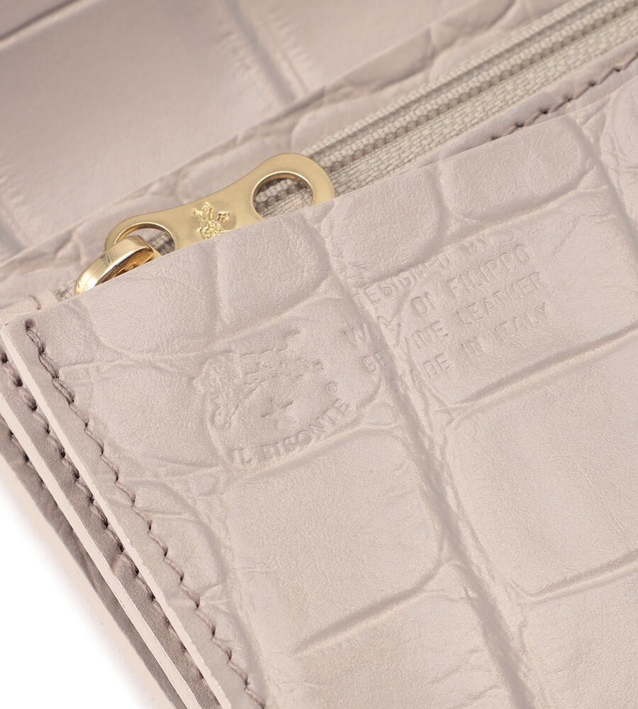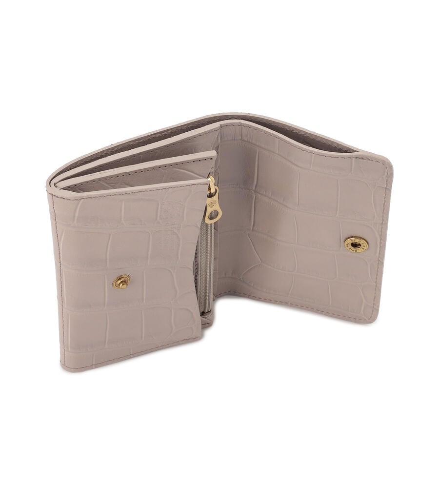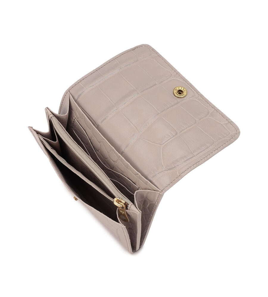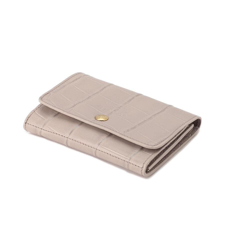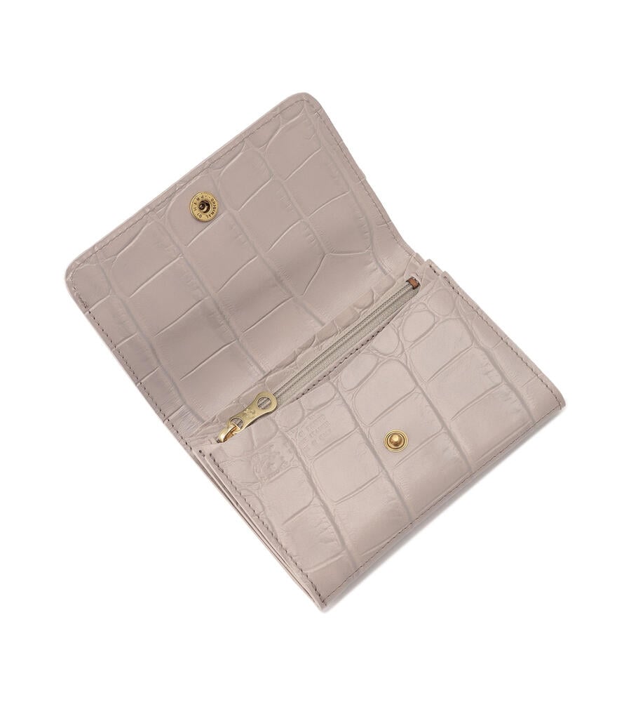 リッチな印象を盛り上げる、型押しレザーの財布。ロゴ刻印とゴールドボタンが上品さを後押しします。内側はファスナー仕様で小銭をきちんと収納可能。仕切りが多いから、カードもたっぷりと入るのが嬉しい。使い込むほどに味を増すレザーは、デイリーユースにどんどん活躍させて。