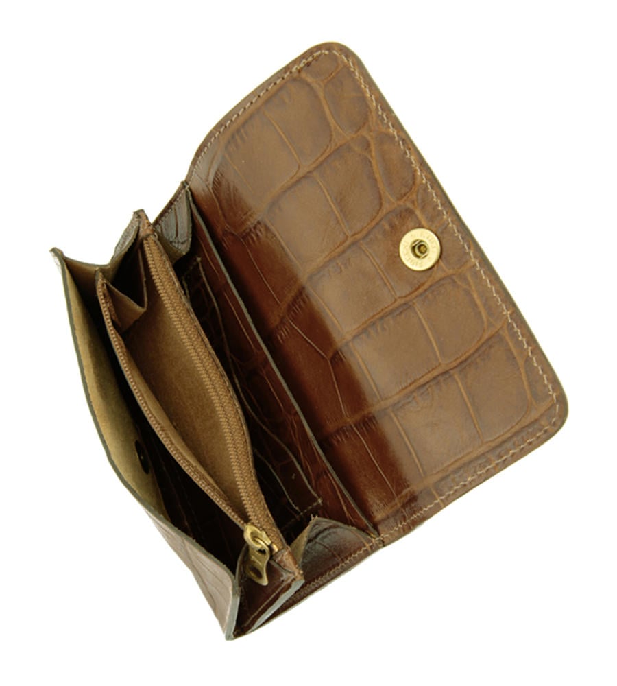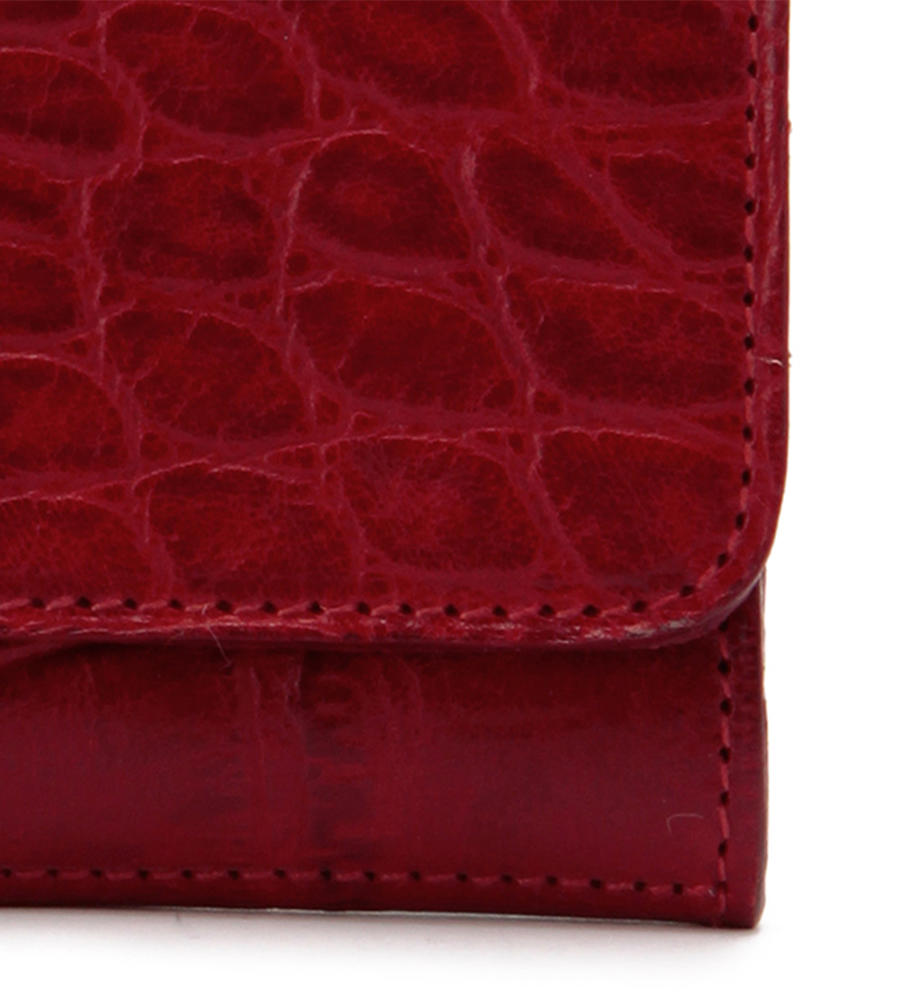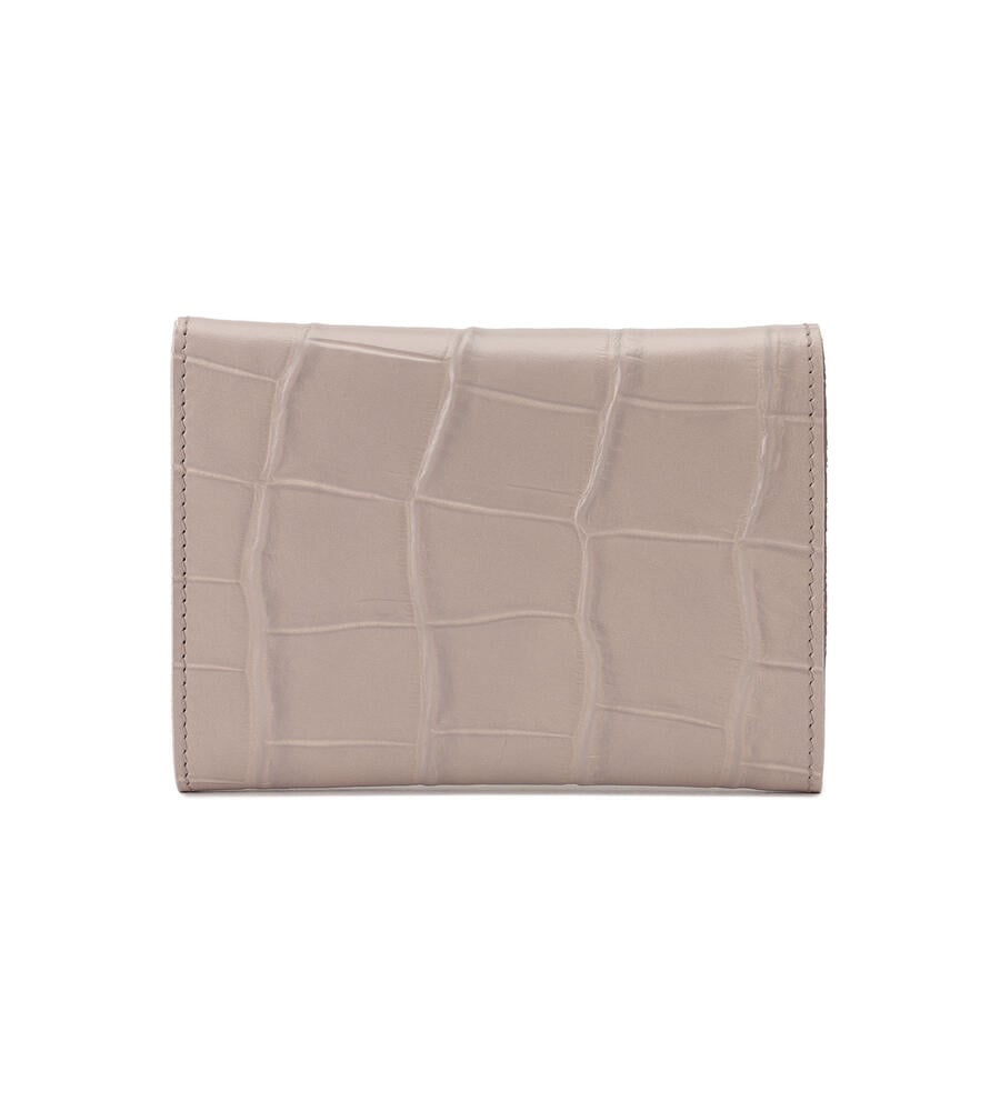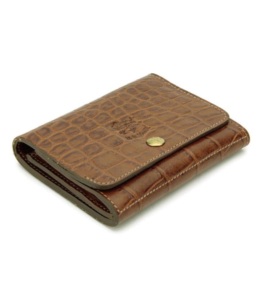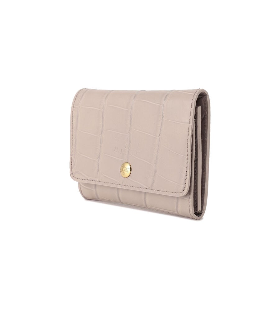 リッチな印象を盛り上げる、型押しレザーの財布。ロゴ刻印とゴールドボタンが上品さを後押しします。内側はファスナー仕様で小銭をきちんと収納可能。仕切りが多いから、カードもたっぷりと入るのが嬉しい。使い込むほどに味を増すレザーは、デイリーユースにどんどん活躍させて。