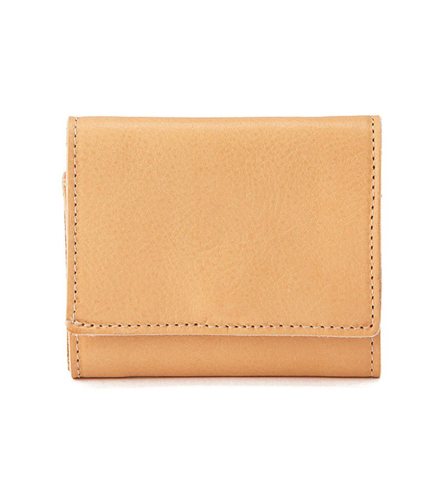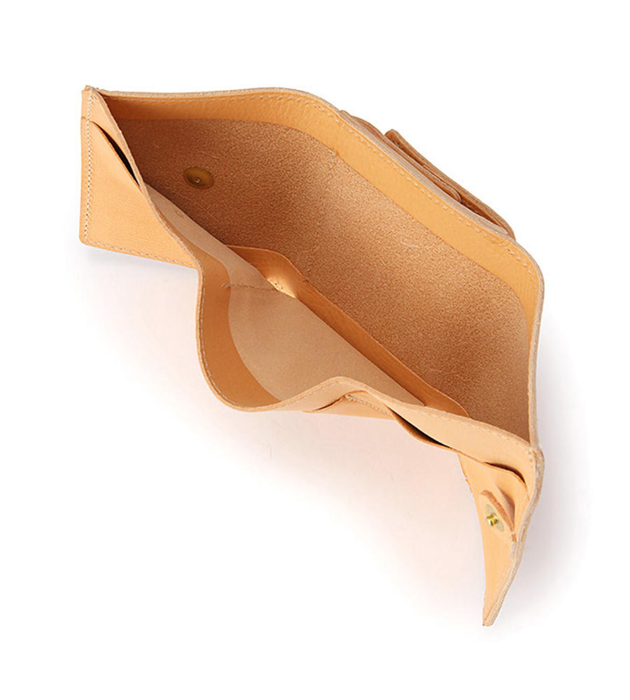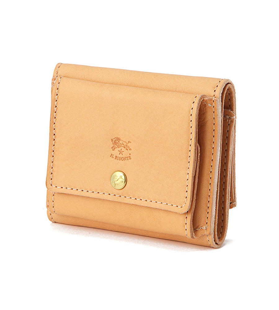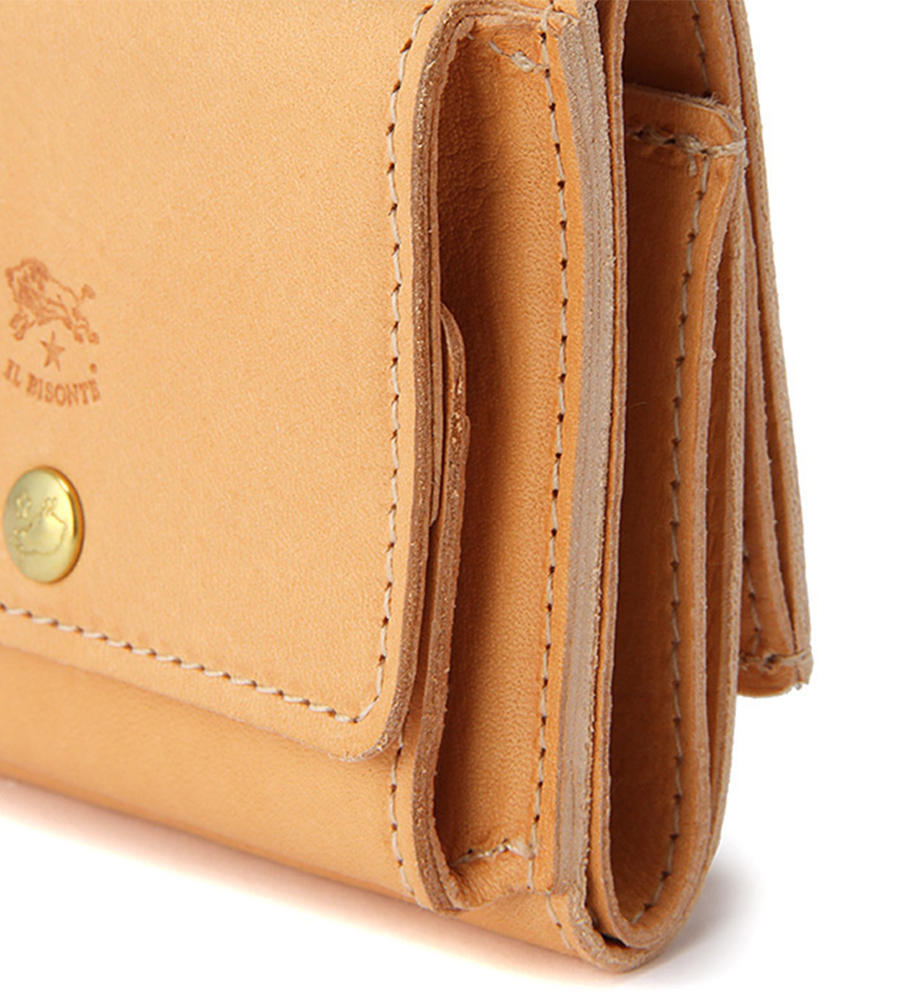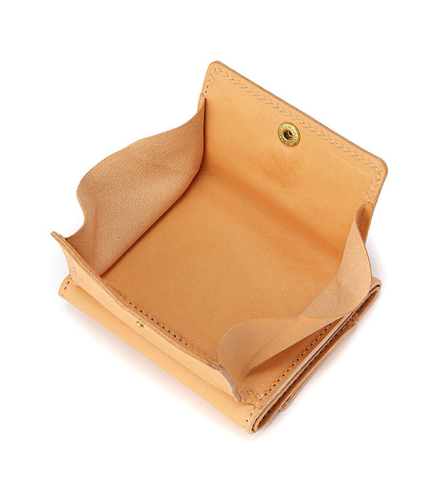 立体的に開くコインケースを外付けした、三つ折りレザーウォレット。コンパクトなフォルムに札入れやカードケースも備えた、充実感のある収納力です。コインをたっぷり入れてもスリムなルックスをキープできます。