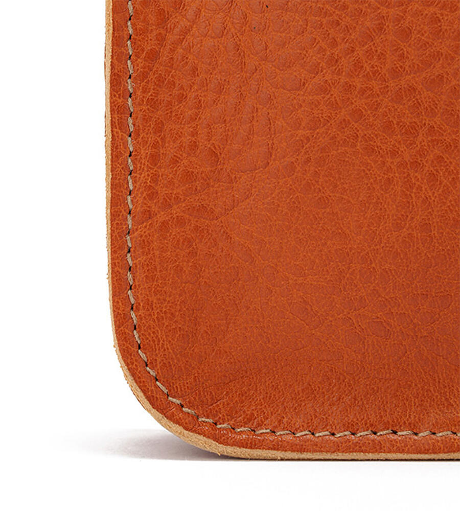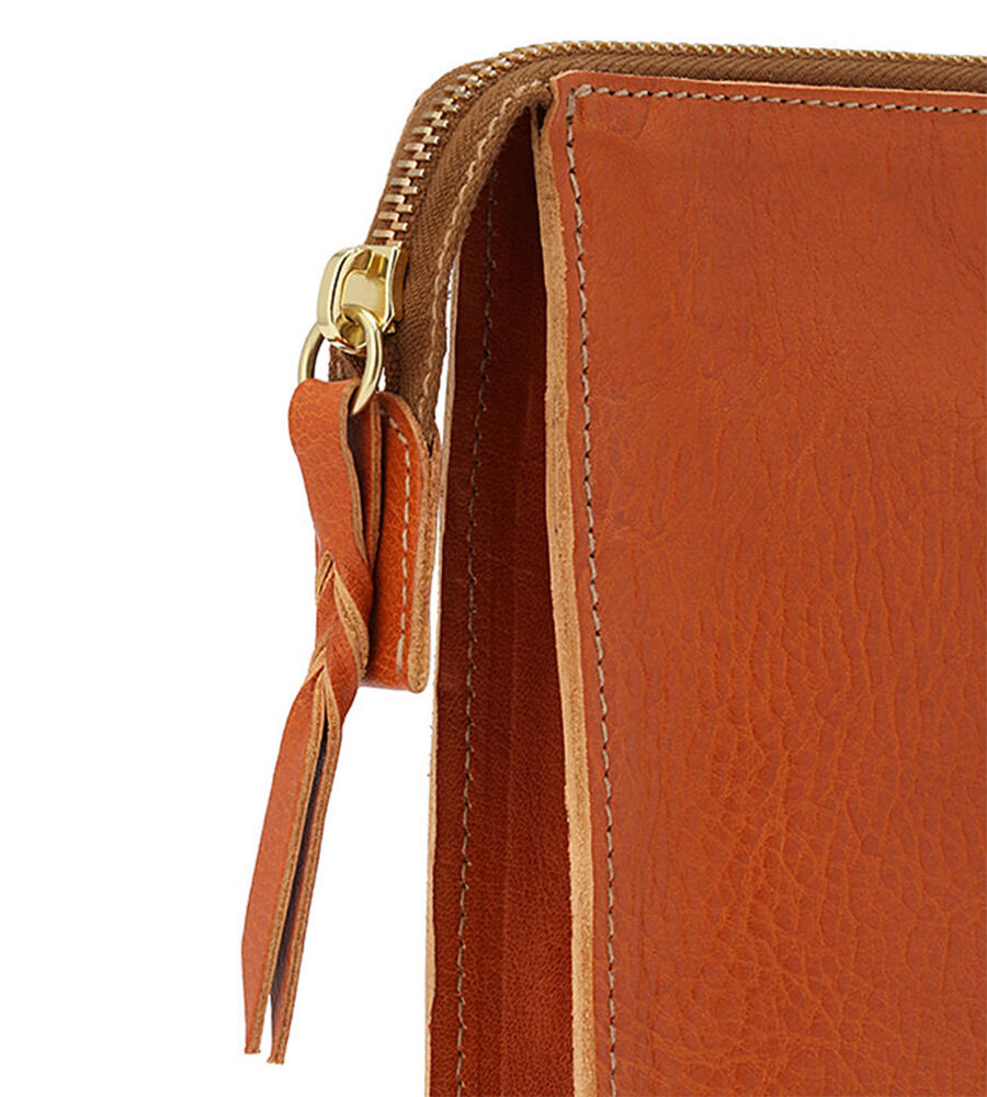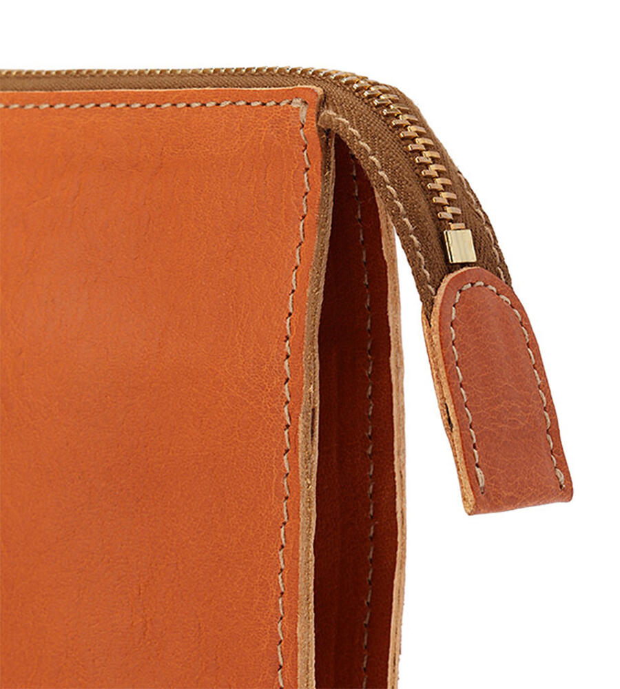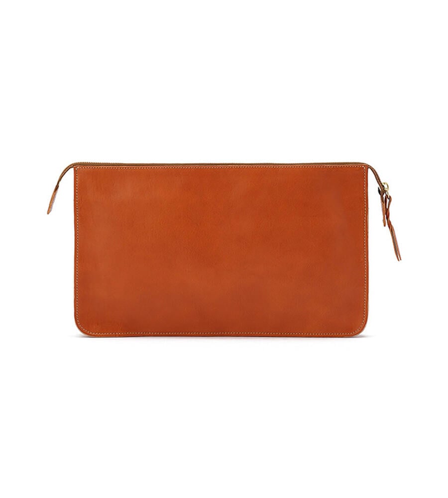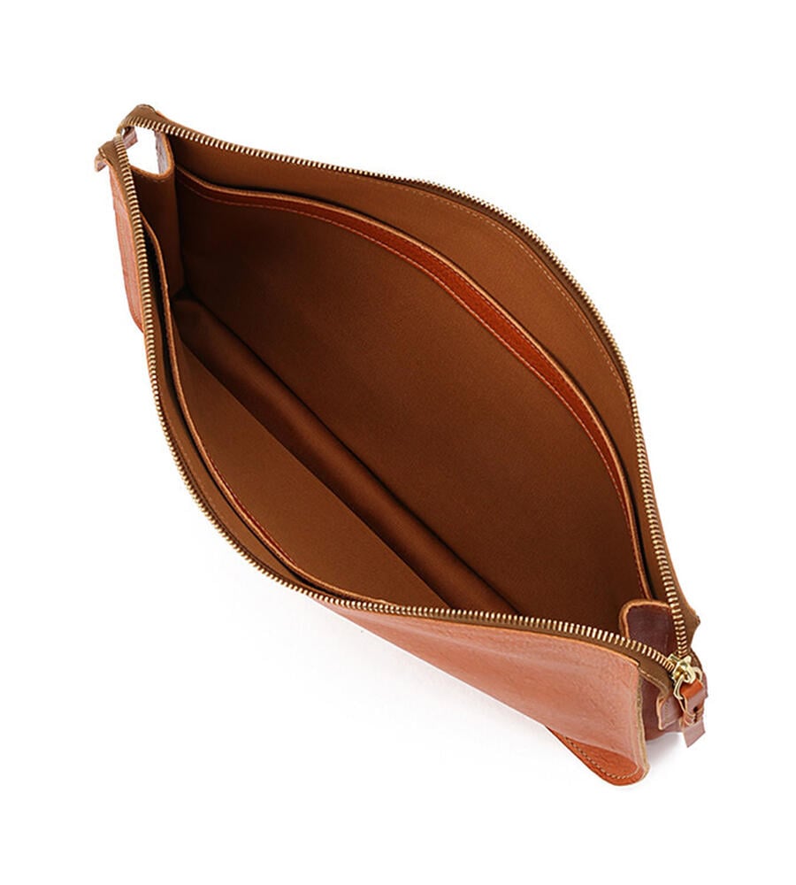小さなバイソンロゴがポイントになったクラッチバッグ。カウレザー素材を採用したため、長くお使いいただけます。中身が一度に見渡せるよう、間口が大きく広がる作りに仕上げました。捻りを加えたジップチャームもアクセントです。